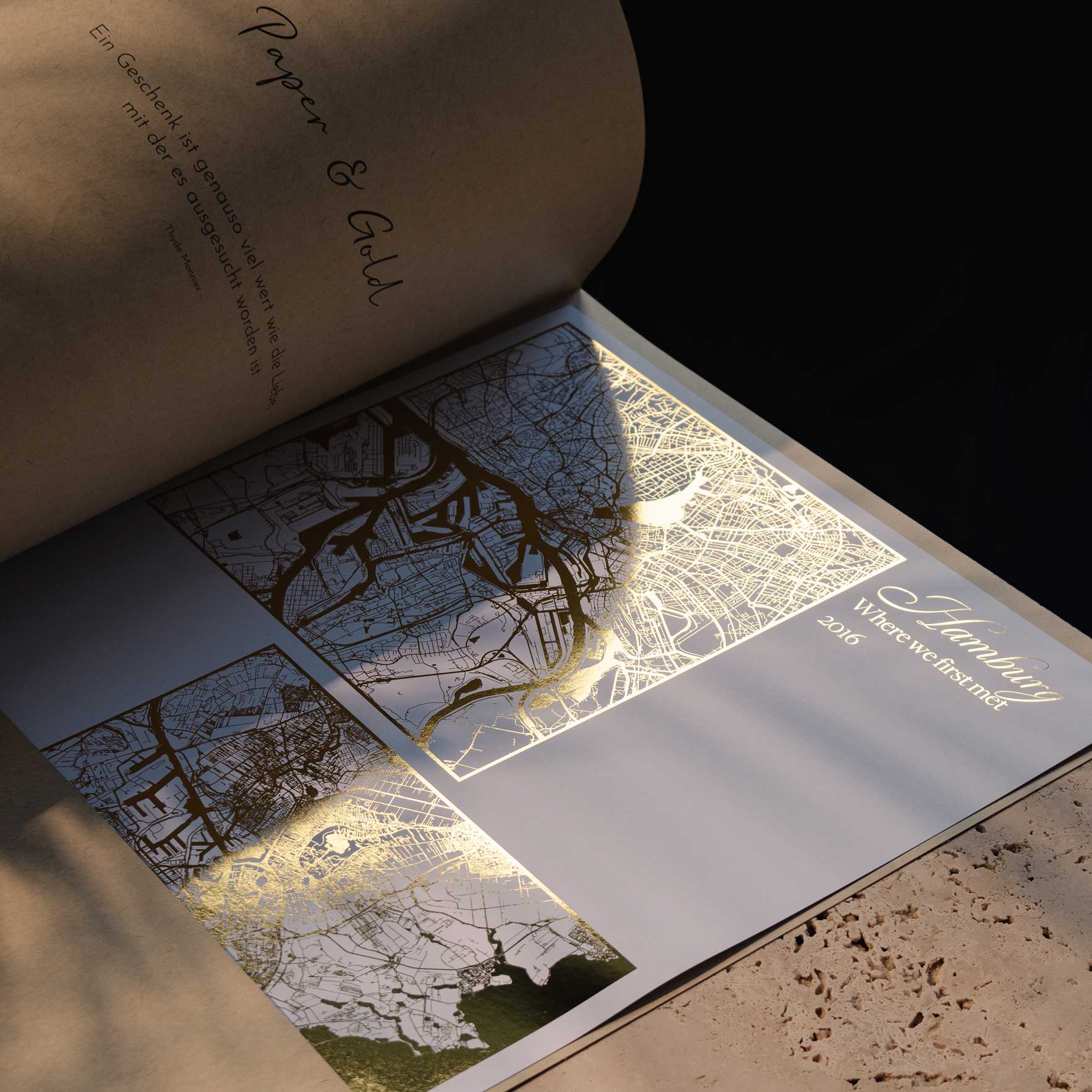 Die Goldfolie übertragen wir in einem aufwändigen Verfahren mittels Hitze und Druck auf das Papier, so dass beide Materialien eine dauerhafte Verbindung eingehen.